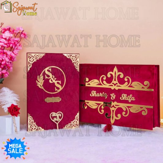 Celebrate your sacred union with elegance, tradition, and meaning through Sajawat Home’s Nikkah Nama Hamper Box – Maroon Edition.