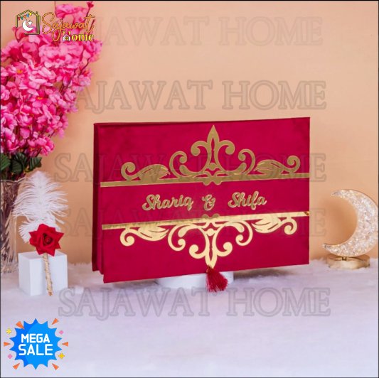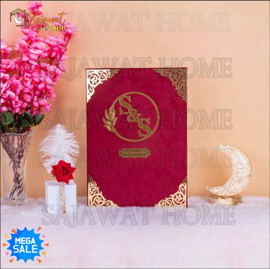 Sajawat Home brings you the Nikkah Nama Hamper Box – Maroon Color – Thumbprint Board – Nikkah Nama Booklet – Pen — ensemble to commemorate your sacred union, blending elegance, tradition, and spiritual essence in one perfect package.