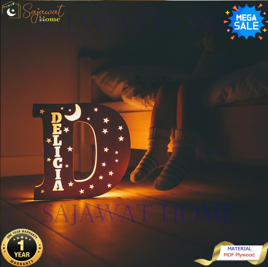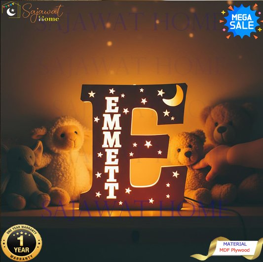 Product Description – Personalized Wooden LED Night LightCreate a truly meaningful gift with Sajawat Home’s Personalized Wooden LED Night Light — a beautiful way to capture names, memories, and moments in a glowing keepsake. Whether it’s for a loved one, a friend, family member, or even yourself, this custom LED lamp adds warmth, elegance, and personality to any space.Hand-crafted from premium MDF pine wood, this night light features your personalized name or initial in a stylish cutout design. The soft, ambient glow makes it perfect for bedrooms, living rooms, offices, nurseries, or as a decorative accent for festive and romantic occasions. Thoughtfully designed and beautifully finished, this lamp turns every moment into a cherished memory.