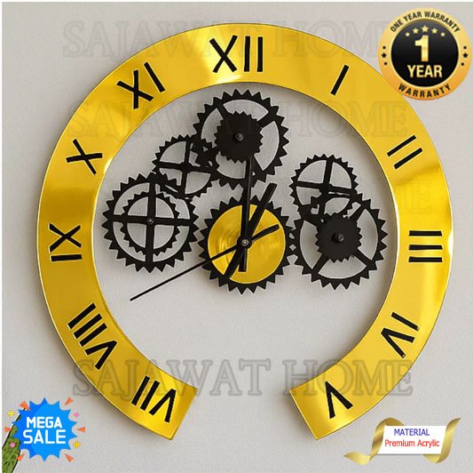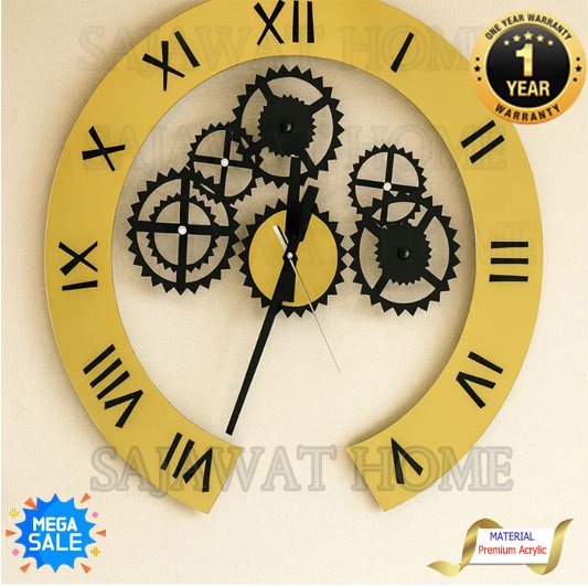 Enhance your interior with timeless luxury. The Golden Gear Wall Clock by Sajawat Home is crafted from high-quality pure acrylic, delivering a crystal-clear, glass-like shine without the heavy weight. With its bold 24×24 inch size and eye-catching exposed gears, this masterpiece instantly elevates living rooms, offices, bedrooms, and reception areas.